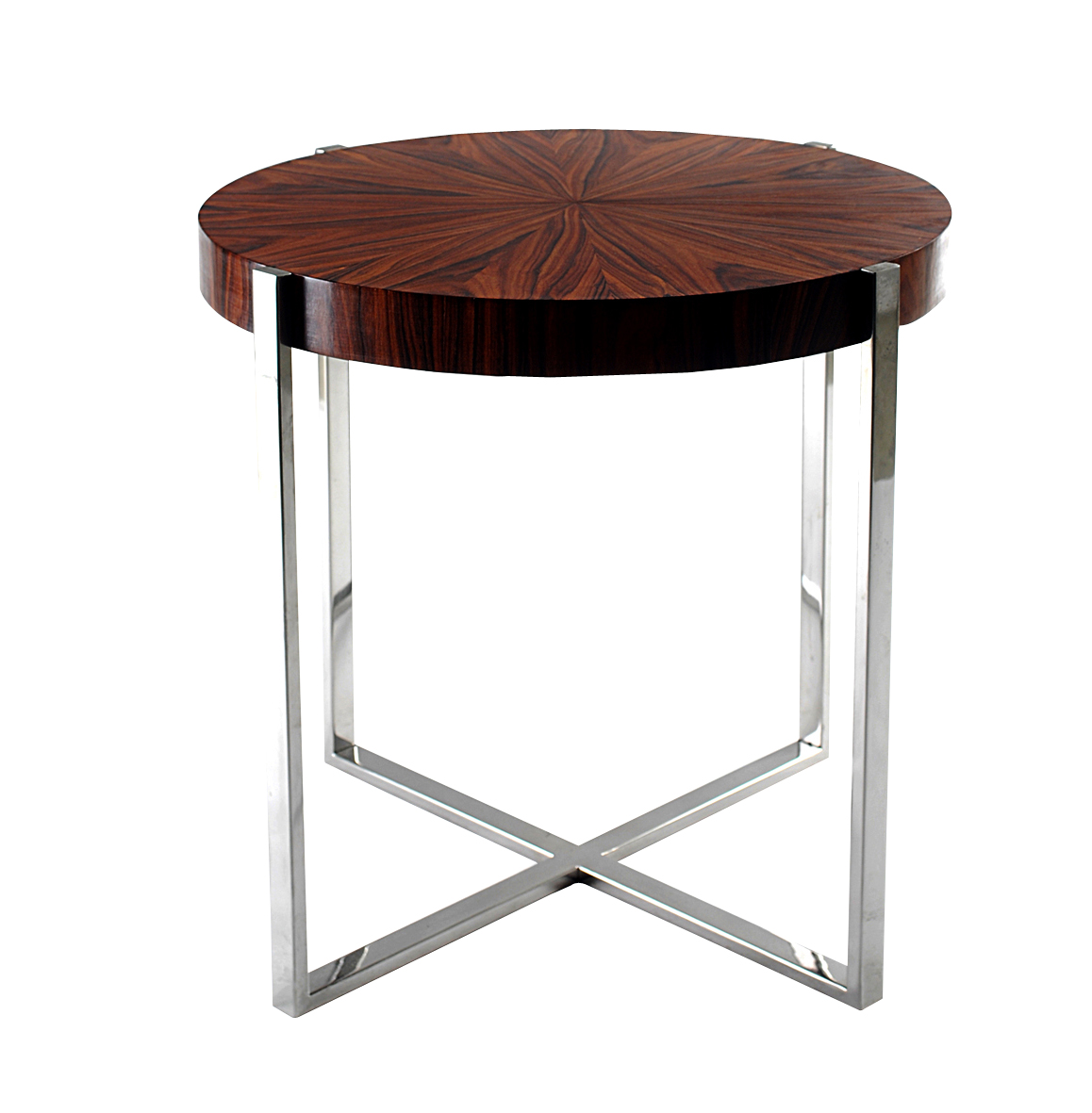 Side table with a round radial matched wood veneer in rosewood top, supported by a polished stainless steel base.