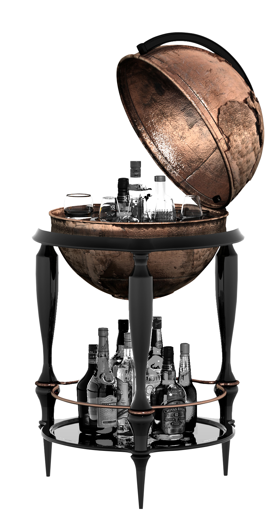 An eye shut travel, back to the 16th century; epoch where the globe had a major role in the navigators’ lives and was the main key to world exploration. Equator is full of “Portugal”: soul, navigators & discovery, represented by the embossed hammered cooper and the elegant wood lines. The delicate and detailed craftsmanship equals one unique jewelry piece. Mixing two necessities of the perfect lifestyle, traveling and celebrating. Ideal for exclusive interiors, this exclusive piece of furniture can be placed at any living or dining room giving it an elegant style providing a journey of pure comfort and relaxation. The Globe is made from polished copper, manually hammered. In its interior there is space for glasses and bottles. The surface of the bottom head’s base is made from black lacquered glass.