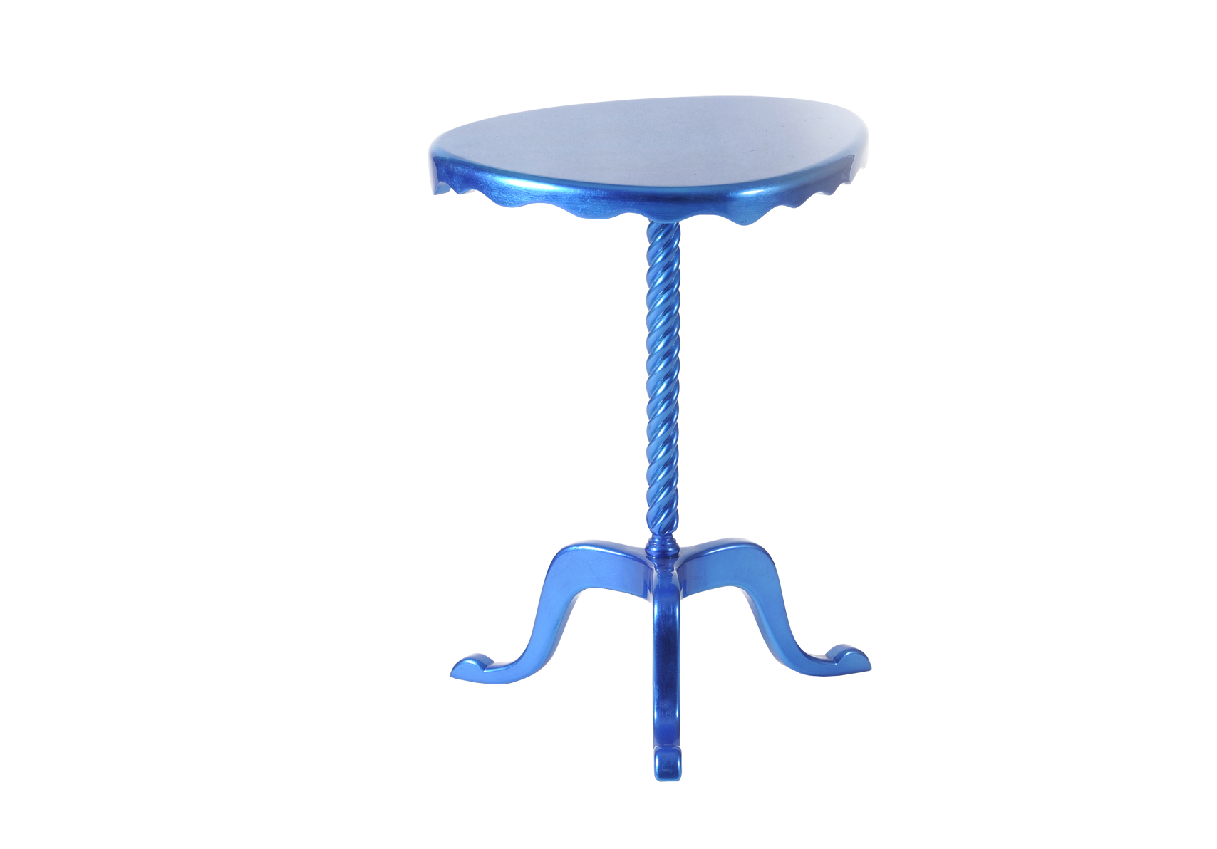 Table in wood, with a twisted column ending on tripod feet. Delicately carved and covered entirely with silver leaf colored in lapis.