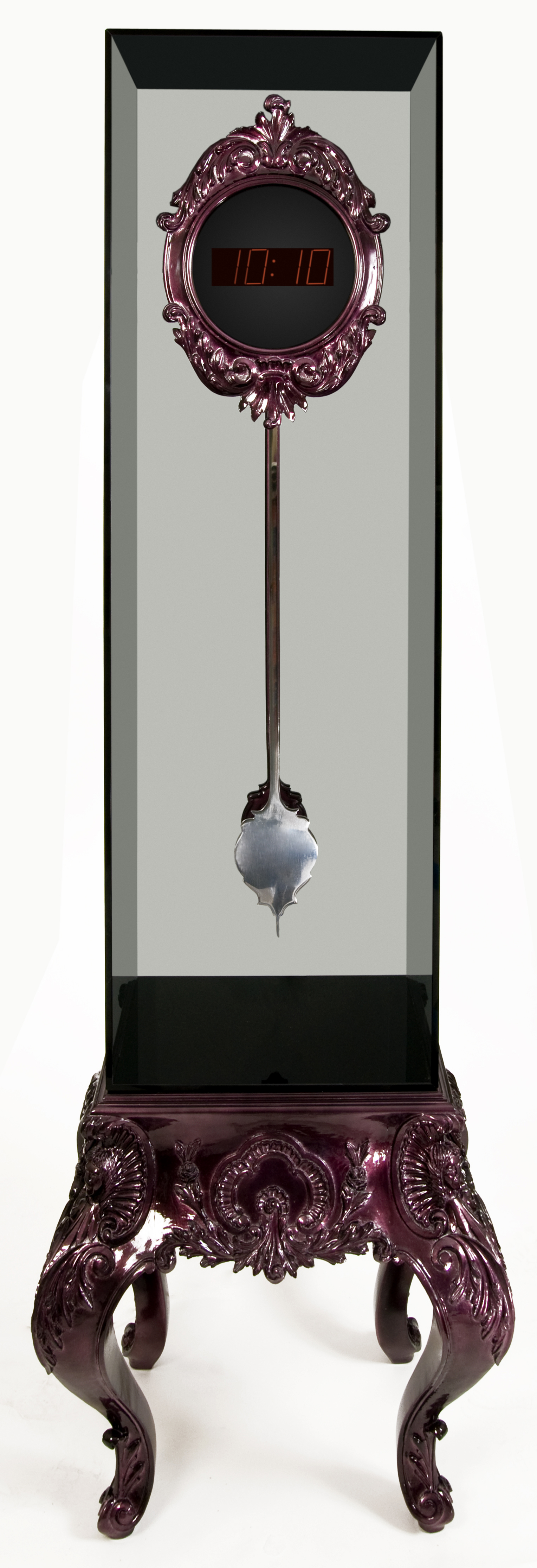 Carved digital clock made from mahogany. The pendulum is composed by stainless steel and inside by a tempered glass box. Hand carved mahogany base covered in silver leaf and finished with a combination of high gloss amethyst and smoked black translucent varnish. Base: hand carved mahogany covered in silver leaf and finished with a combination of high gloss amethyst and smoked black translucent varnish.