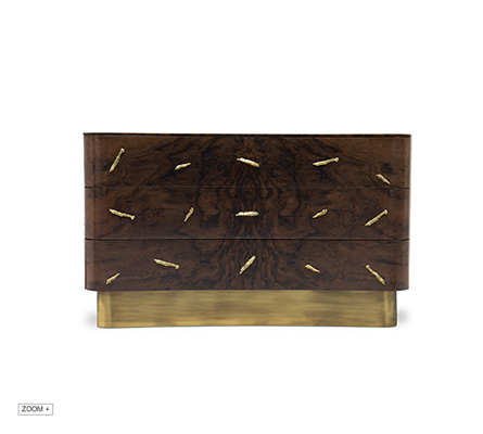 Baraka is an ancient Sufi world which means ''a blessing or as the breath, or essence of life'' from which the evolutionary process unfolds, and also that is believed to be possessed by certain persons and objects. The spirit or BARAKA inspired the creation of a cupboard that uses no language because its design speaks magnificent images of natural beauty. Charismatic by its never ending contrasts between ancient and contemporary lines, BARAKA Cupboard body's half brightness combines walnut root veneer with brass details, an interior in bird eye wood veneer and the base in vintage matte brass. This exquisite design piece that stands out outside of historical time will enhance the beauty of Baraka energy into your modern living room set.