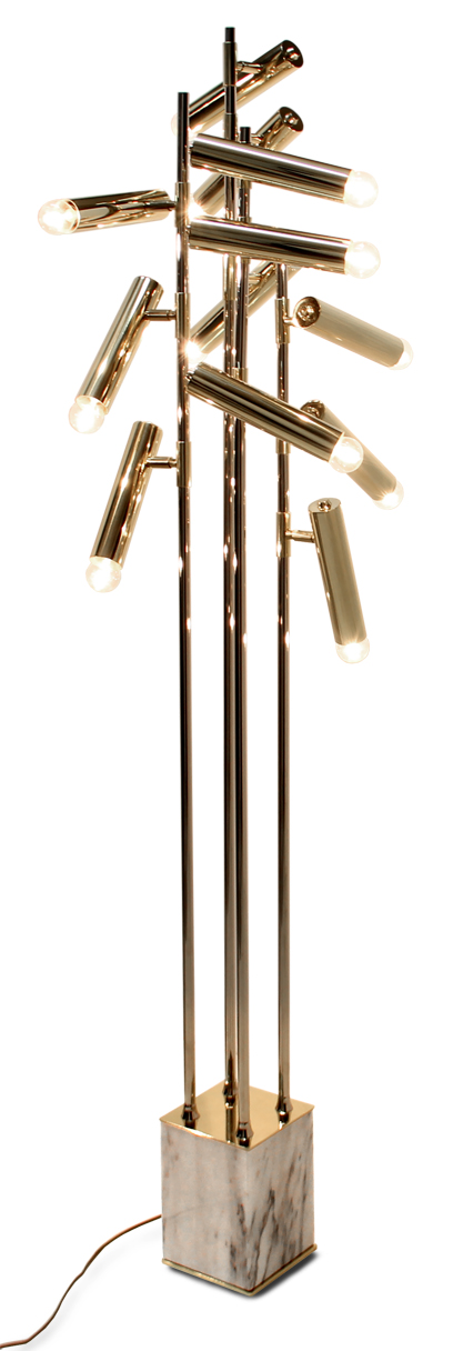 CYPRES, Latin for Cypress, is a tree of many symbolisms and ornamental capabilities, often seen in artistic works and gardens. The unmistakable foliage grows in dense, dark green sprays which lends a full imposing body to the tree. CYPRES Floor Lamp stands strong like the tree with its four gold plated brass sprouts emerging from the Carrara marble base, and the lamps acting as the oblong seed cones fully illuminating the surrounding space.