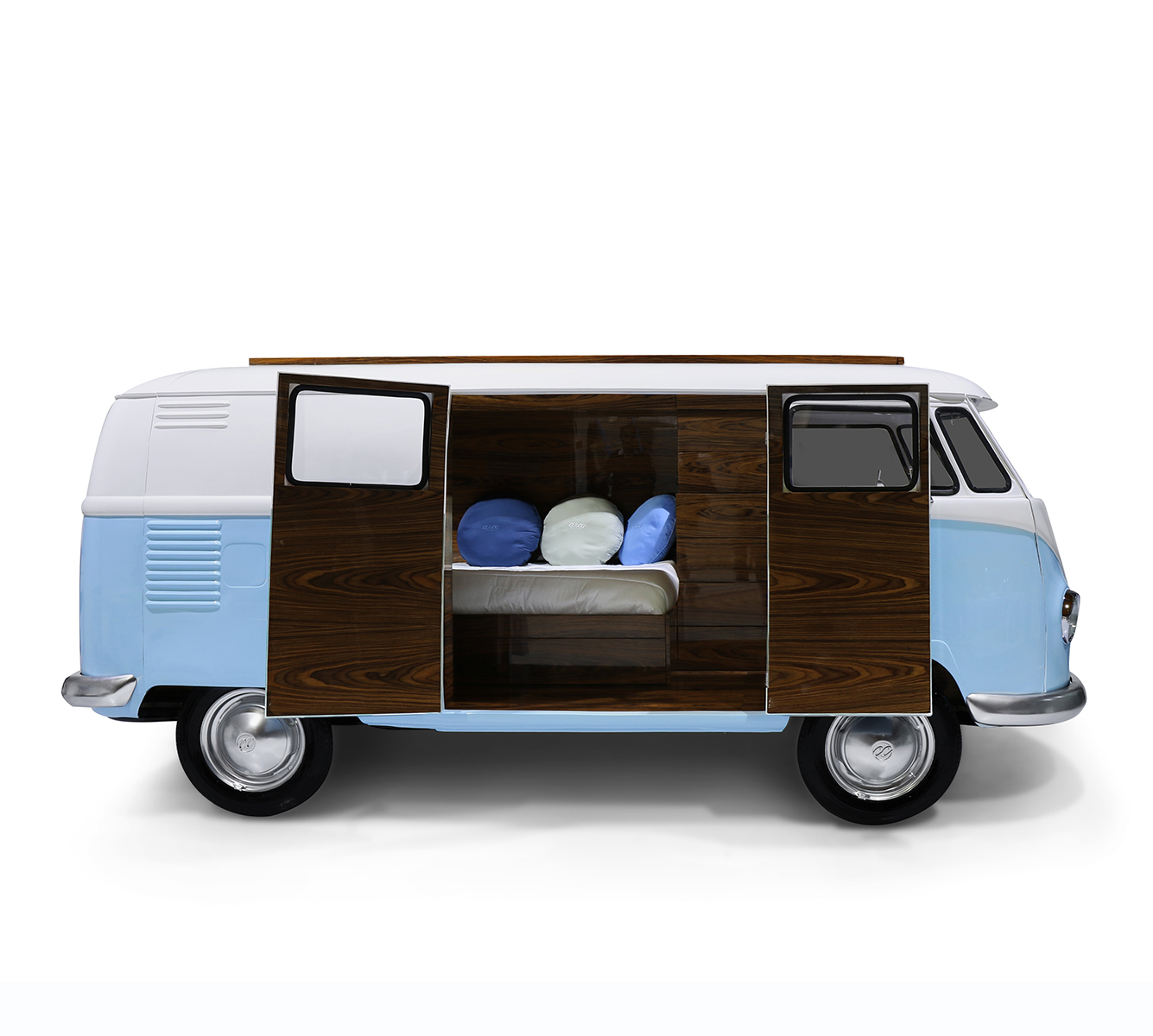 Bun Van is a bed, reinvented by Circu. This bed is perfect to bring some fun and imagination to rooms! Inspired in one of the most iconic and magical symbols of fun and freedom! This is one of the most remarkable vehicles ever produced. Few other vehicles have the ability to turn heads and conjure a spirit of freedom, adventure and open roads. The exterior of this piece is made in fiberglass with chrome plated finishes; the inside is made in palisander wood veneer. Inside it contains several storage compartments, a bed, a tv, a secretary, a mini bar and a sofa.