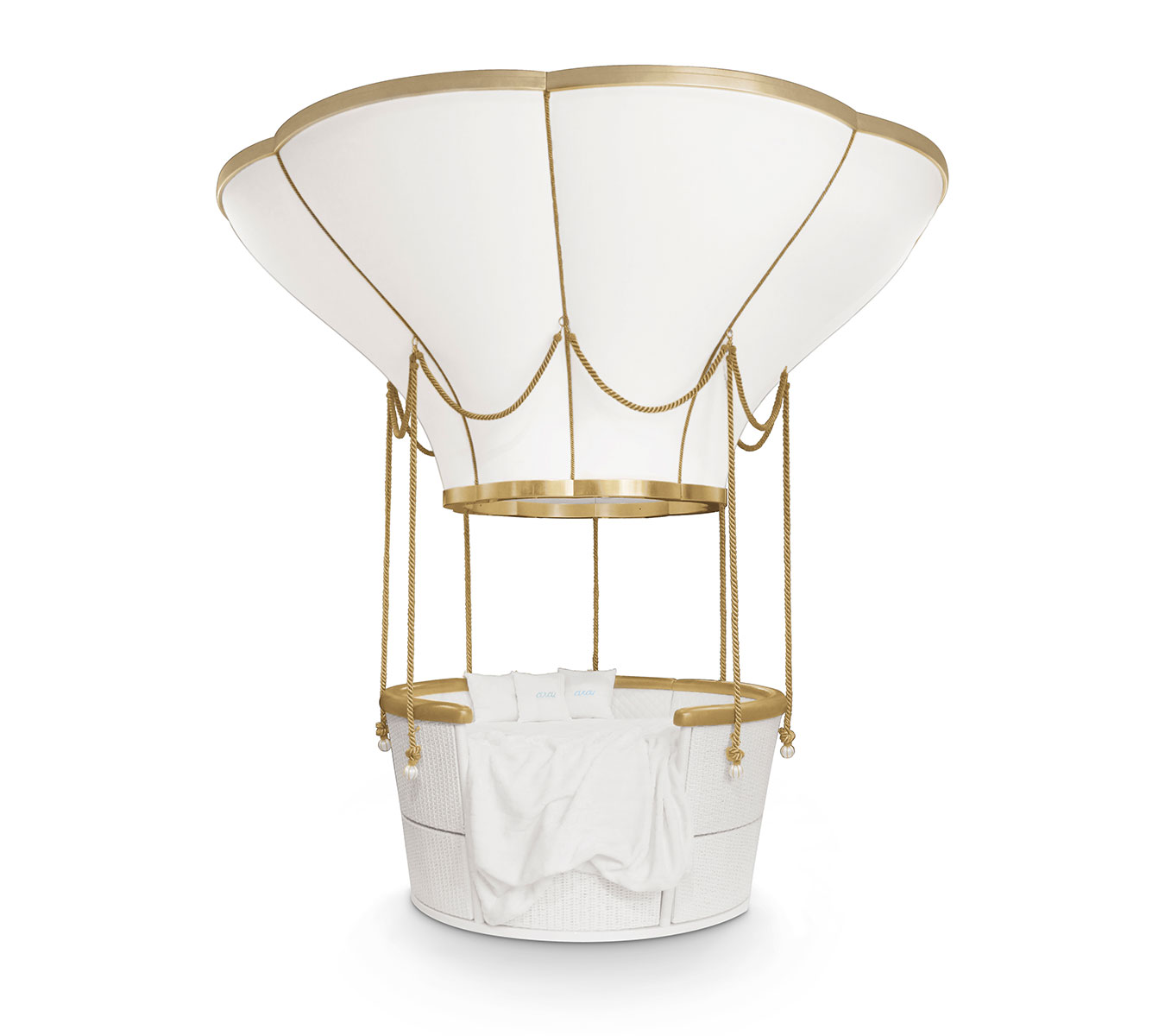 The bed part is made with traditional basketry technique, with the remaining structure made of wood with white lacquered gloss finishes. It contains drawers that can be used as storage. This bottom part can also be converted into a sofa. The top parts are all upholstered in synthetic fur, trimmed in wood with gold leaf details. The strings are made by hand with traditional techniques and the metal parts are finished in gold bath. Light and sound system are controlled by a mobile app (Ilight) with several options: choice of music, light effects, and sleep time. The Sofa part is made with traditional basketry technique, with the remaining structure made of wood with white lacquered gloss finishes. It contains drawers that can be used as storage. This bottom part can also be converted into a sofa. The strings are made by hand with traditional techniques and the metal parts are finished in gold bath.
