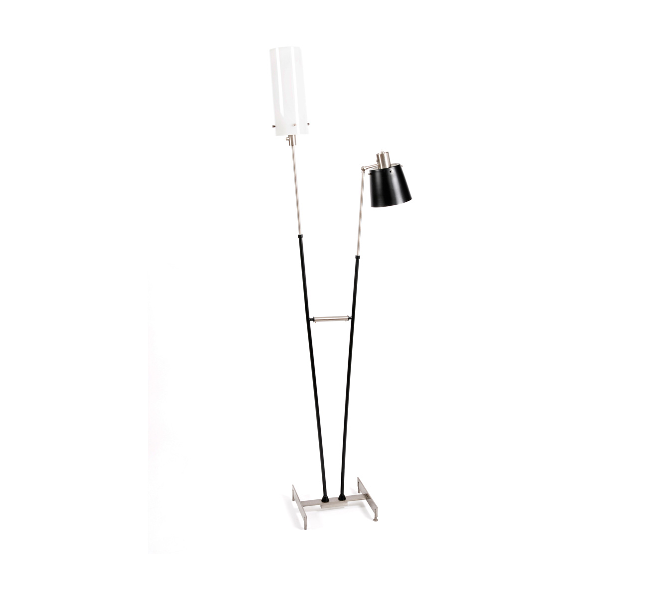 Pastorius standing lamp is the ideal corner piece for a lobby or a living room. It has a balanced elegance and presence. Made with architectural environments in mind, it is a mid century lighting design classic. This piece handmade in brass and its lampshades in aluminium and in acrylic.