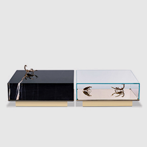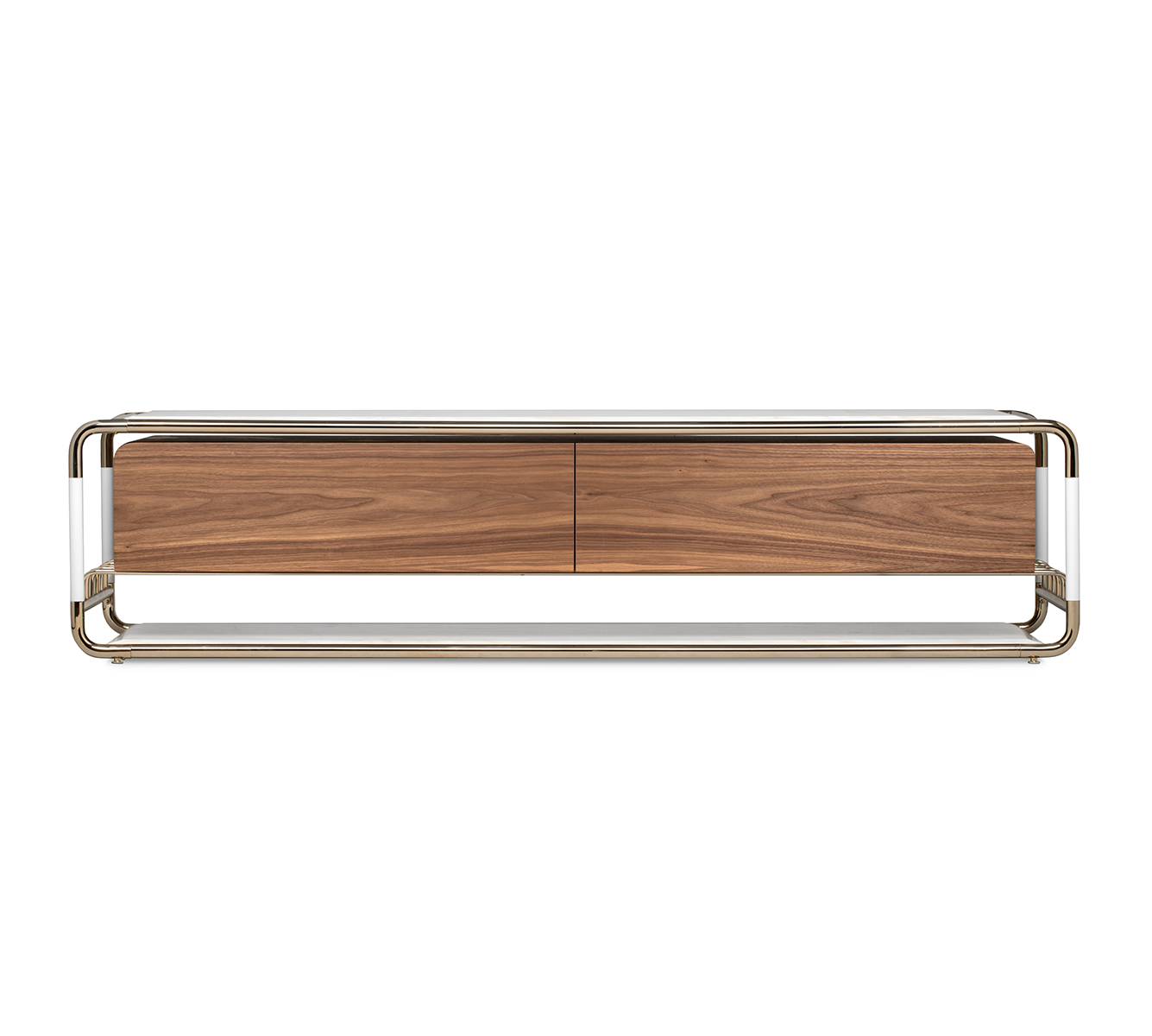 Lautner is a TV table that uses a tubular polished brass frame structure as a support. It combines clean lines with the most noble materials from mid-century design, using marble on the countertop and varnished walnut wood on the two long-length drawers. There is a shelf at the base that provides additional storage.