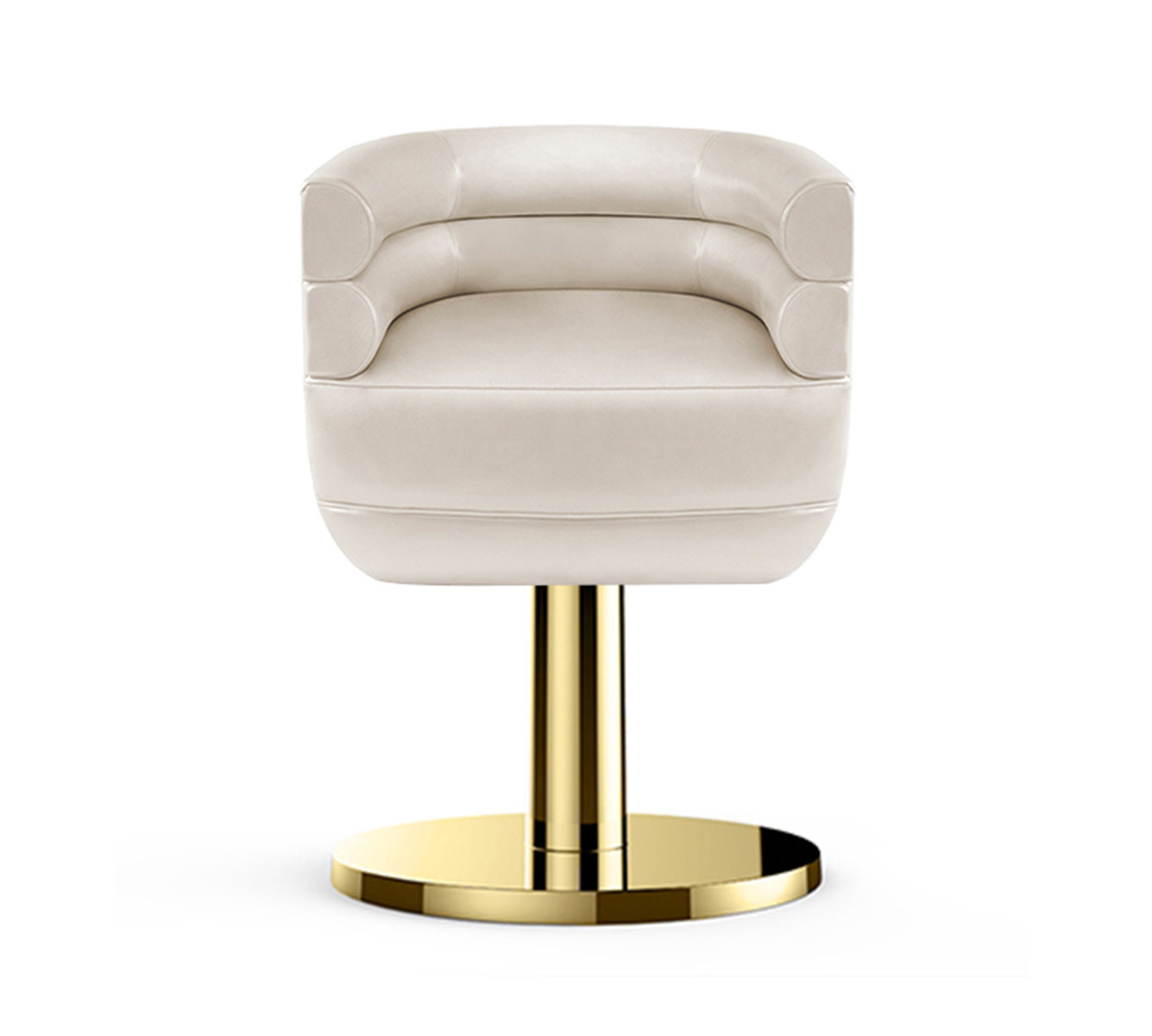 Loren Dining Chair is a tub chair with curvilinear forms. Its sleek look can be compared to the space age aesthetics, usually designed with bright colors and basic white. The arms are attached to the back, giving it a sense of continuity, while the beige leather outlines a modern design approach.