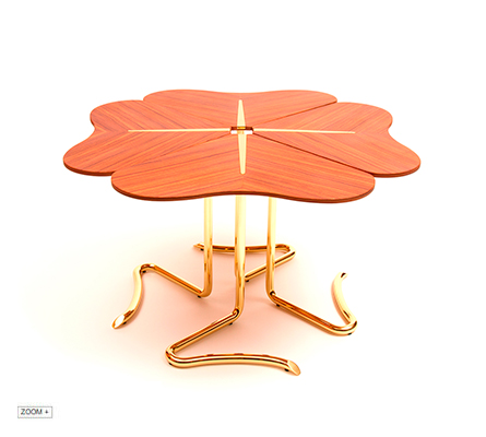 Four… for Luck is a special clover with a creative process based on the interpretation of the Legend of the 4 leaf clover, in which each petal represents a meaning. The concept of total independence was explored so that the four constituent parts of the whole – Hope, Faith, Love and Luck – can play a free specific role whenever necessary. Slender and projected in the air, each petal finished in listed rosewood veneer is like a real leaf in which the organic thin stem rises dividing it into two parts. This detail of separation that creates the continuity between petal and stem is emphasized in polished brass. The excellence of materials and finishes combined with the accuracy of the small details makes this center table a true refined and elegant furniture piece.