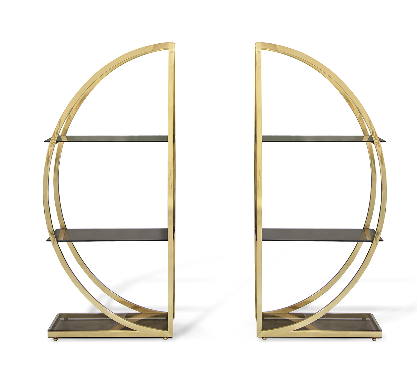 Indulge in the opulent essence of Art Deco design with the Decadence Bookcase. Two ornate metal semi-circles are joined in a glamourous union by sleek glass shelves and her backless design allows for the perfect canvas to store your simple pleasures.