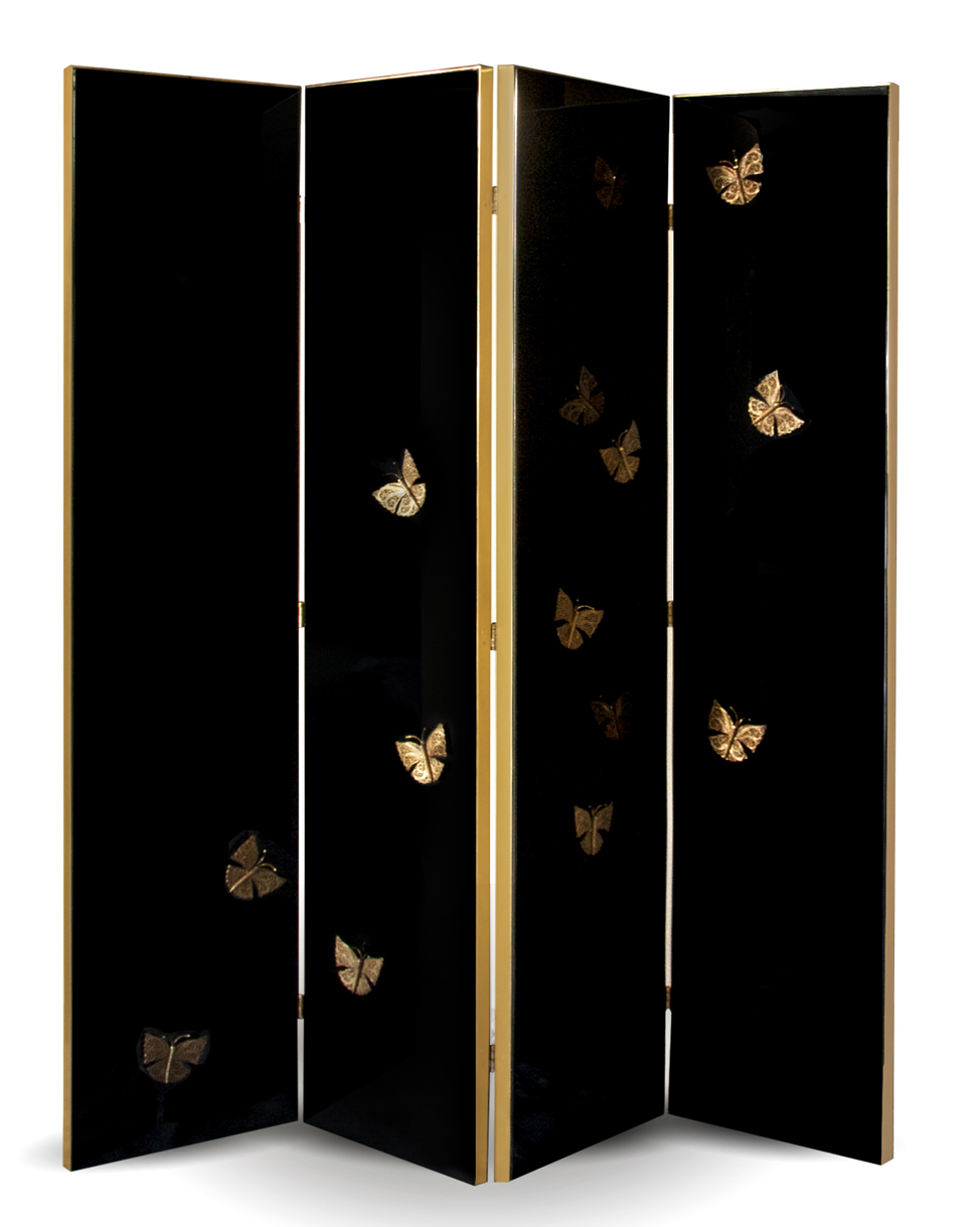 Four panels intricately detailed with brass butterflies serving as hinges and accents throughout the screen.