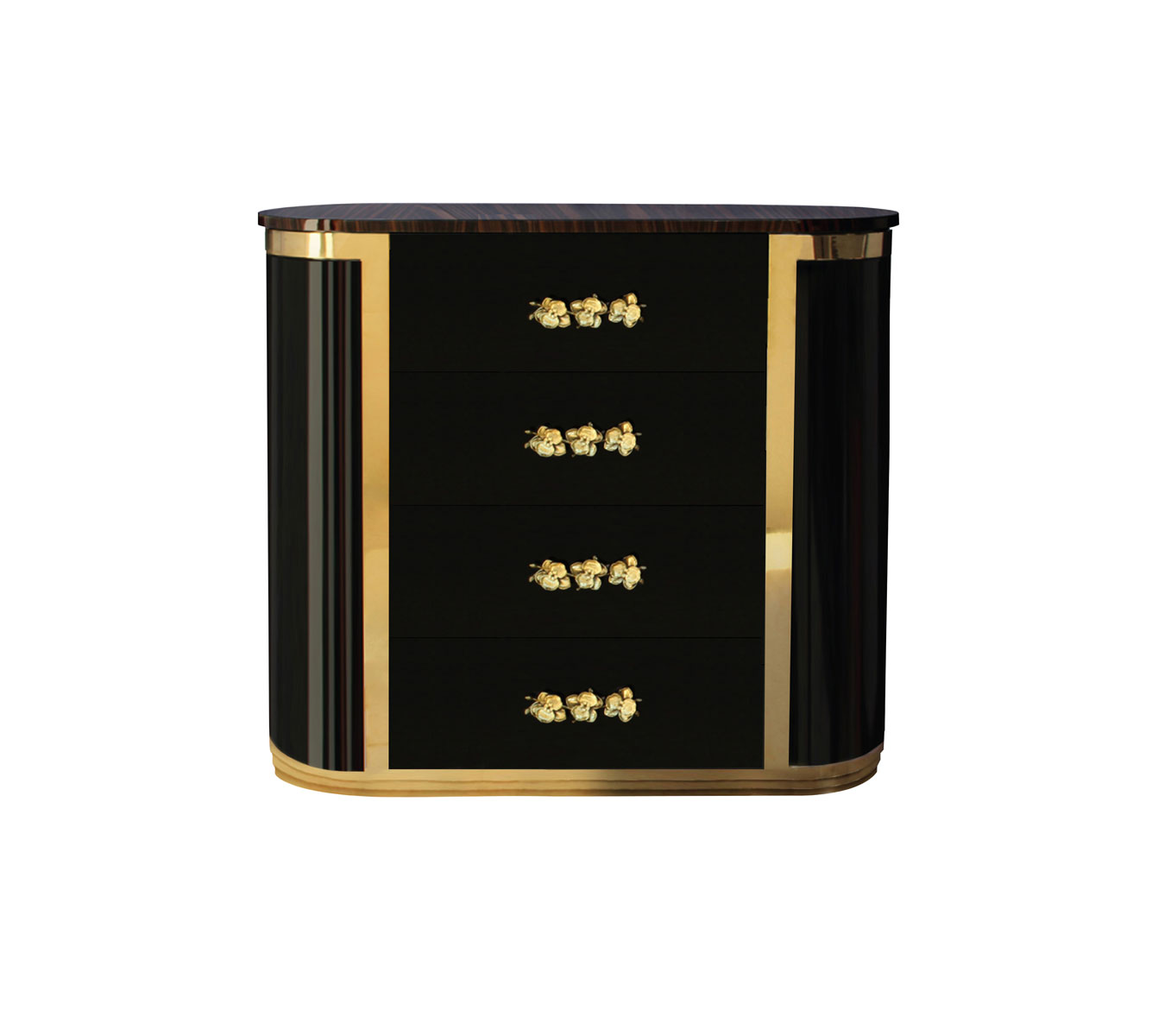 The vintage-inspired drama of this elegant bedside table captures the essence of haute style. Sensuous curves and subtle gold gilt makes the Orchidea an irresistible choice. Oval top with 4 drawers lined in black velvet and adorned with cast bronze orchid handles supported by a metal base.