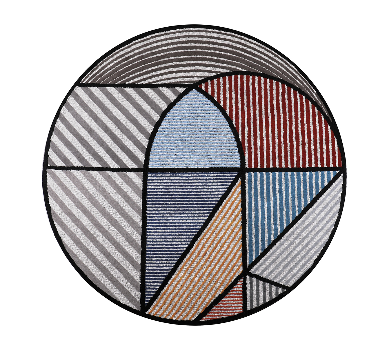 Pop style and geometry hold hands in Lola, a hand tufted rug full of personality dinamism, in which the design plays with the conjugation of straight lines and the round shape of the rug. Made with New Zealend wool and linen, the bold colors from Pop style contrast with the Mid Century brown and grey, in an interesting conjugation of styles.