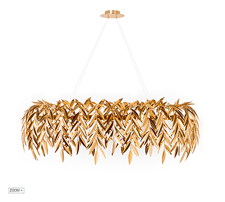 Resulting from a wonderful trip through the interior of S.Miguel, the Azores chandelier recreates a special weeping willow found near a lagoon and freezes a moment of contemplation. A luxuriant lighting piece made with handcrafted brass leaves that subtly allow the rays of light to pierce them and illuminate the surroundings as a gift of nature.