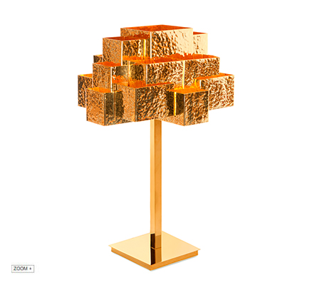 Inspiring Trees is the essence of a personal fascination. Slender, geometric and seemingly minimal, is a lighting piece fully executed in brass which carries form, image and meaning and wants to pass a message of equality among the numerous species of trees without highlighting any particular example or feature. In the ‘treetop’, the detailed hammered handcrafted work for visual transformation of the material, captures the richness of light and shadows present in any real tree, leaving a serene brightness take care of its trunk and base. The light is distributed by the three levels of the ‘treetop’ and diffuses, controlled by the geometry of several overlapping pieces, lighting the surrounding space in an unexpectedly way; almost ethereal.