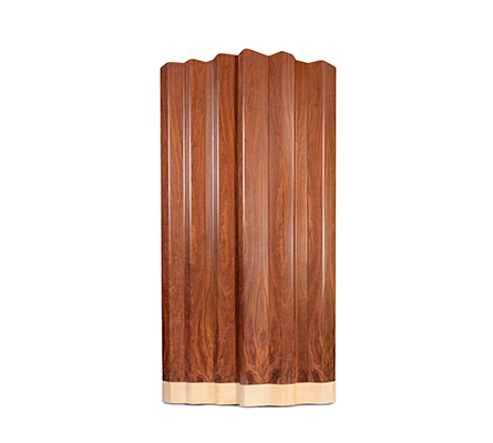 The cabinet Navajo Canyon reinvents the glorious majesty of Arizona cliffs with their twists and turns along the Colorado River. With the identical proportions and tones of the rock formations sedimented over thousands of years, this cabinet is built through a complex process finished in full height walnut veneer and its base in white sycamore. By accentuating the long exterior lines without any visible opening, the apparently solid volume resembles the stone walls, so we can travel a long journey through the serpentine cliffs. On the walnut interior of the cabinet, two glass shelves go unnoticed while the turquoise silhouette of the Colorado River suddenly appears between four drawers. Taking advantage of the natural curves, each drawer opens, unveiling its interior totally lacquered in the same hue which gives us the feeling of jumping in freefall from the top of the cliff to dive in the crystal clear waters of the river.