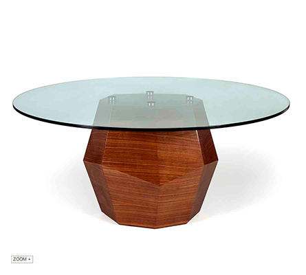 The robust volume of Rock dining table entirely finished in walnut veneer on an elegant faceted work that resembles the irregular nature of rocks, descends from the original designs created on the Three Rocks set of center and side tables. Completed with a round top is in glass,the construction process is entirely involved with the skills of Portuguese artisans to achieve the singularity of an exceptional handmade central piece designed for the most distinctive interiors.