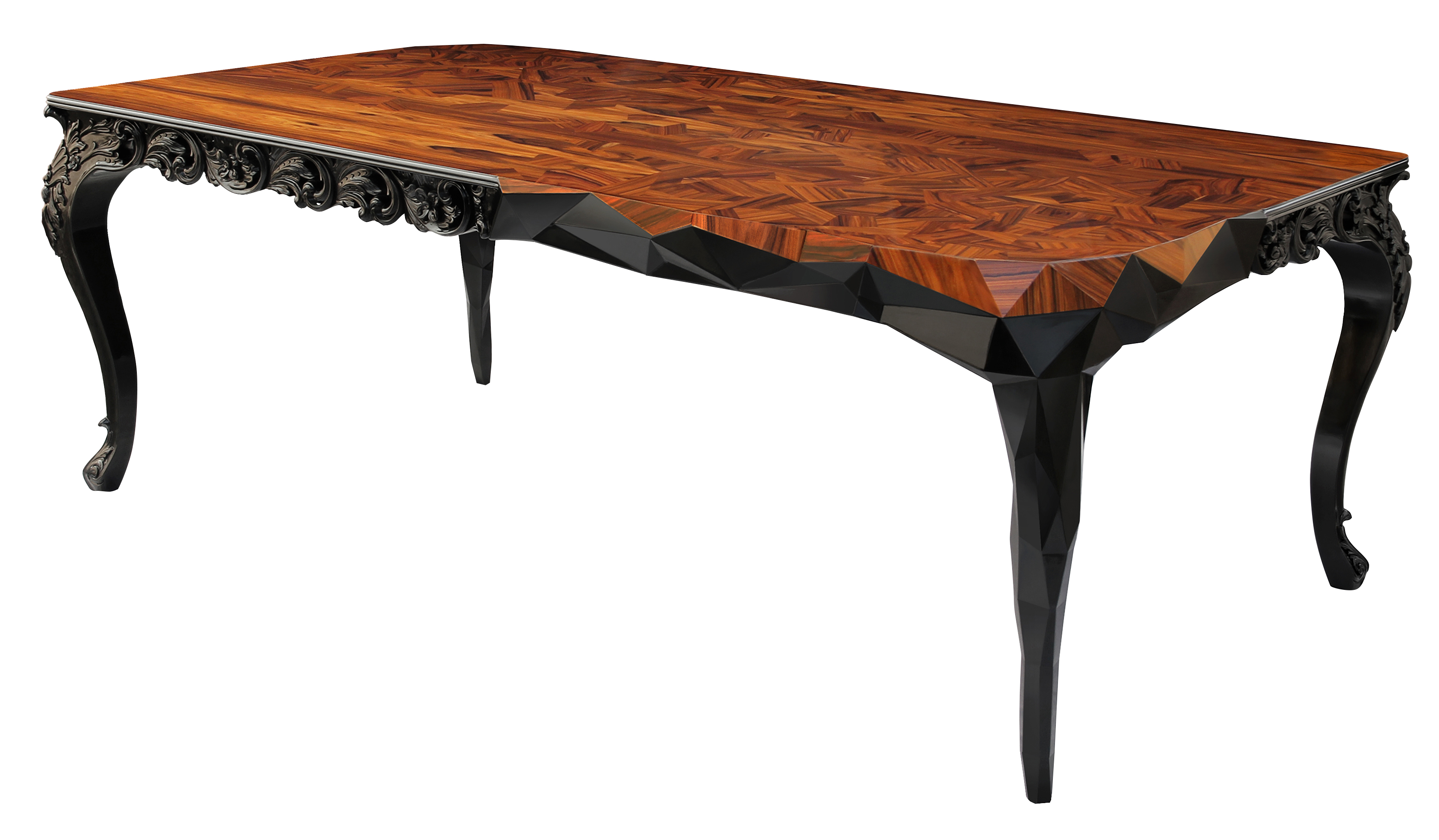 Dining Table made from wood with carved legs, in a baroque and minimalist faceted style.