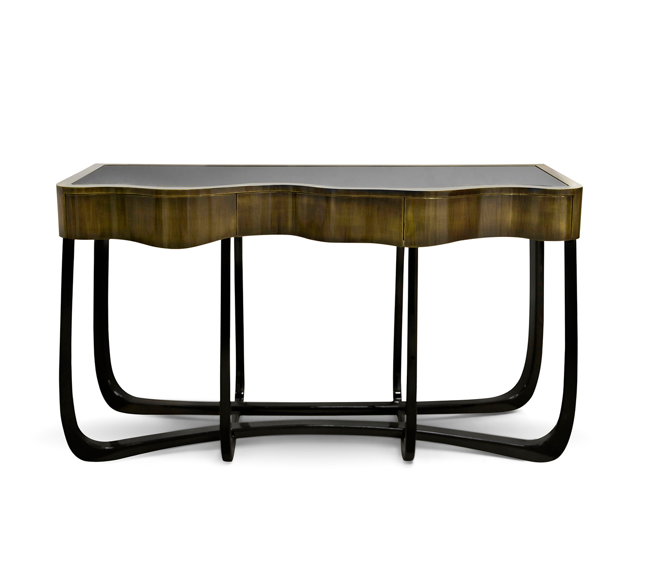 Boca do Lobo is an exclusive design furniture company that transcends the fusion of traditional and contemporary design. With Sinuous Patina Console you will successfully create a luxurious environment. Sinuous lines draw the elegant character of this console, gathering the styling of the best sellers of Coolors Collection. Sinuous is made for those who love harmonious lines mixed with exquisite detail. Its design is seductive and lures you into a magical and golden world. To achieve extravagance, Boca do Lobo’s artisans handcrafted the structure in mahogany with a high gloss black lacquer finish and top coated in polished brass plated, bringing up the vivid and bright side of Boca do Lobo. Contains three drawers.